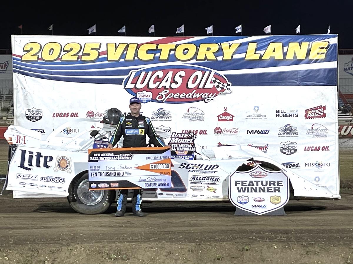 WHEATLAND, MO. (Oct. 12, 2025) - After dominating most of their events, Johnny Fennewald and Tony Jackson Jr. both fought off late-race challenges to bring home $10,000-to-win features on Saturday night at Lucas Oil Speedway.